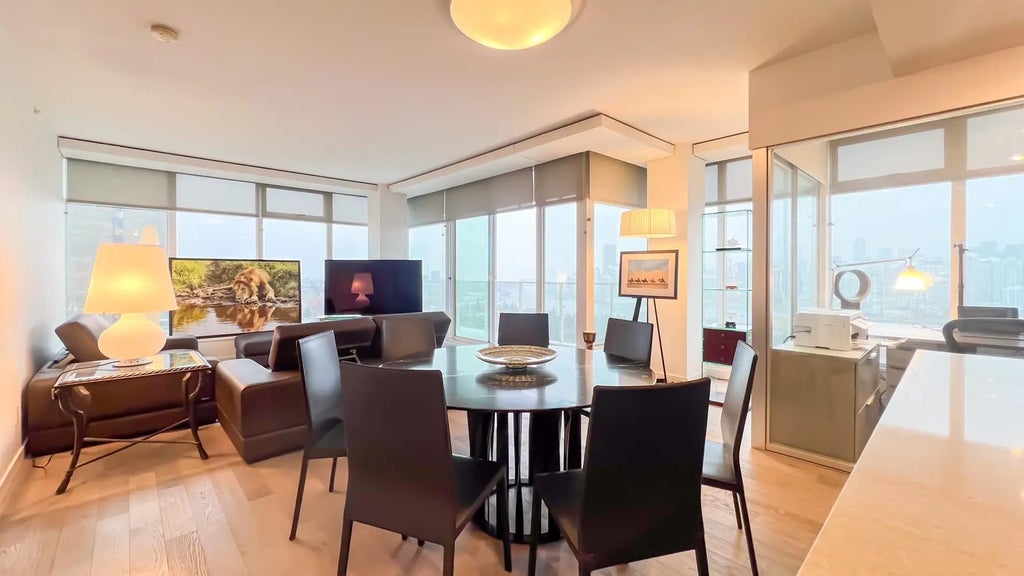 Excellent view and location, well-maintained luxurious suite with over 1,500 square feet featuring 3 bedrooms plus den, solarium & 2 bathrooms NW facing corner unit with stunning 180 degree unobstructed views of False Creek, North Shore mountains & the downtown. Gourmet kitchen, contemporary finishings, oak hardwood flooring & geothermal heating/cooling system. Two bathrooms has Nu-Heat heating flooring. Minutes to Canada Line, VGH, restaurants & banks. Owner has paid extra to buy three storage lockers and four parking spots, three of them has EV charging, all doors been changed and upgraded, three bedrooms floor changed from carpet to hardwood flooring, new sub zero fridge. All measurements, floor plan, video, photos by Almond Tree Media Inc. https://my.matterport.com/show/?m=B4E9YJEKQDW
