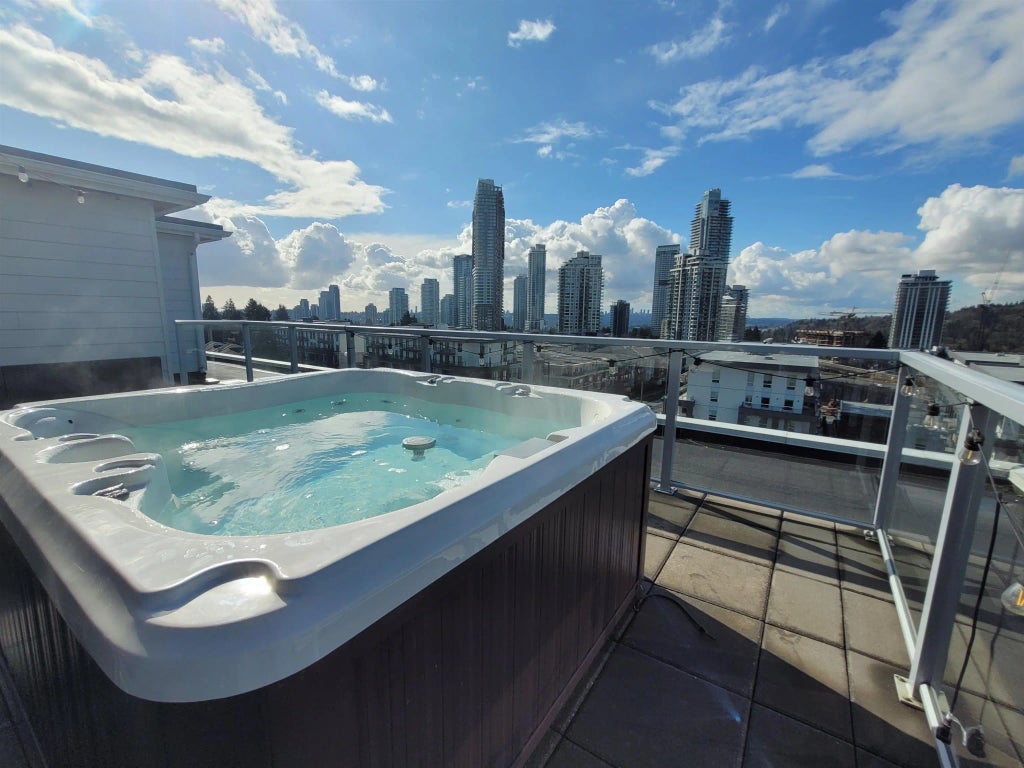 Welcome to YOUR NEW HOME situated in the desirable Coquitlam West Neighborhood. This penthouse unit features 2 bedrooms + 1 den, in addition to 2 bathrooms. The unit boasts a Private 521 Sq Ft rooftop patio on the 7th Floor, equipped with its own hot tub and stunning views of the city and mountains! This unit has a modern layout with an open concept design, along with an 82 Sq Ft balcony off the kitchen. The interior space is furnished with Premium Kitchen Aid stainless steel appliances, gas stove, garburator, and quartz countertops. The laundry is conveniently located within the suite! The property includes 2 standard parking spaces (1 is EV ready) and 2 storage lockers. It is ideally positioned just steps away from the Burquitlam sky train station, shopping centers, schools and parks!