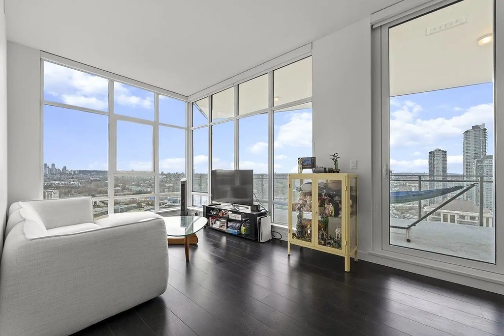 SOLO DISTRICT TOWER 3 built by Appia Development. Concrete highrise, corner unit facing south and west. 2 bedrooms, 963sf, 2 bathrooms, AC, 2 balconies with city, downtown, north Vancouver mountain view, functional layout, high ceiling 11' throughout. Includes 1 parking, and 1 storage locker. Spacious gourmet kitchen with luxious appliances, wood flooring throughout. Great facilities and concierge service. Walking distance to Brentwood mall, skytrain station, bus loop, cinema, supermarket, restaurants, bank, and park.