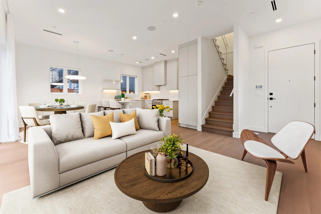 Welcome home to this brand new 3 bed/4 bath 1/2 duplex in Grandview Woodlands! Thoughtfully designed, this home offers a seamless blend of contemporary style & quality finishes with an efficient floor plan. Main level features 10 ft high ceilings, living room is complete with a gas fireplace and a 12 foot sliding glass doors, a well appointed kitchen with Fisher & Paykel appliance package. The second level boasts the bright primary bedroom w/ensuite, a 2nd spacious bedroom w/ensuite and the laundry. Top level offers a spacious 3rd bedroom & full bath. This home comes fully equipped with A/C, 635 sqft crawl space for storage, extensive millwork, a one car garage with EV charging capability, and private yard. Call for viewing appointment.