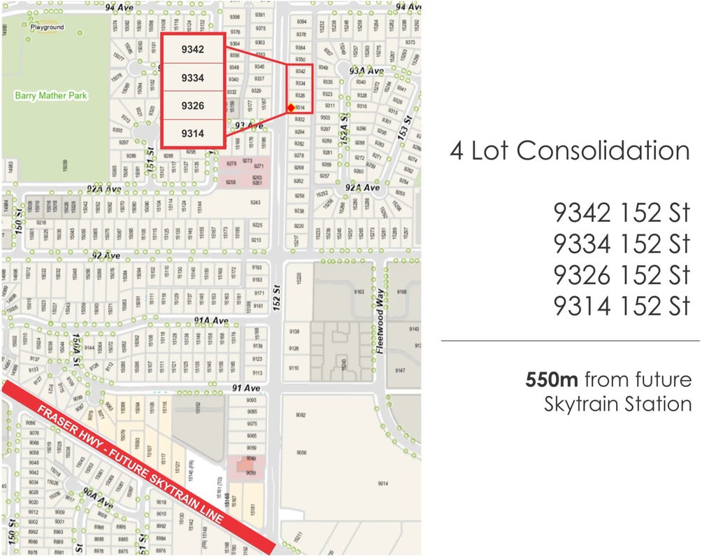 Invest in the future of Fleetwood. Land assembly opportunity in the heart of Fleetwood, Surrey. This development site is the first of its kind along the arterial 152nd street corridor between two main booming town centers in Surrey: Guildford and Fleetwood town centers. This parcel offers immense potential for the development of a low-rise residential building. positioned just 550 meters away from the future SkyTrain station at 152nd and Fraser, Guildford town Centre. A landmark project is expected on this prime location on 152nd street. All measurements are approximate, buyer or buyer's agent to verify.