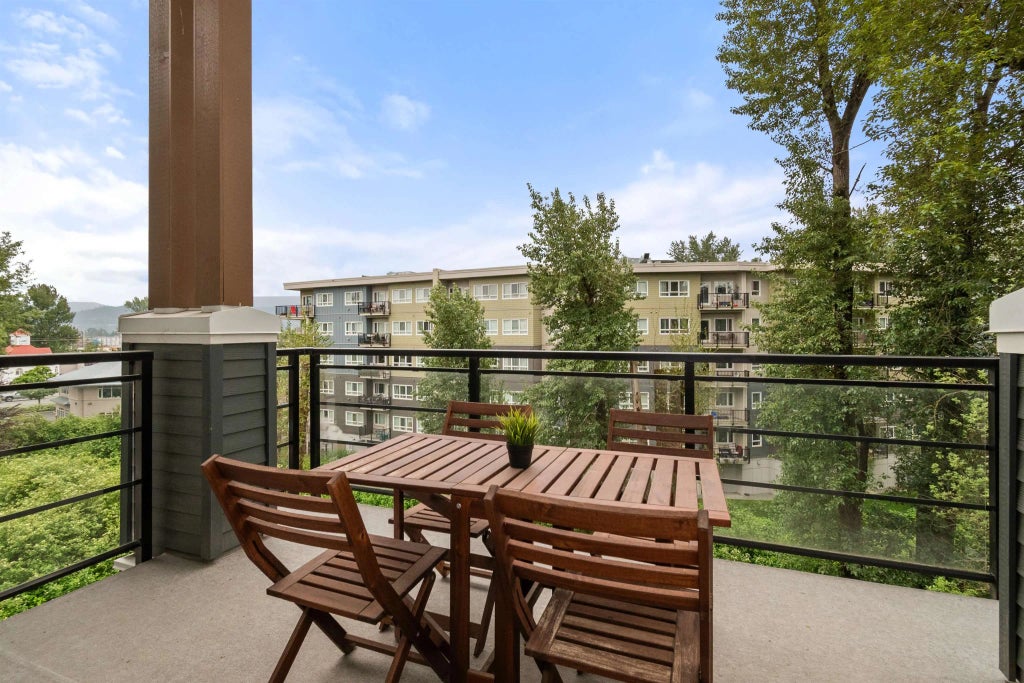 Contemporary TOP FLOOR Condo at "The Elliot''. This bright south facing *like new* 2 bed 2 bath + den will wow you with its high end modem vibe, great layout and 9 foot ceilings. The Kitchen is super spacious with granite counters, an eat up bar, and stylish stainless steel appliances. Full sized stacking washer/dryer. Vinyl plank flooring in the main areas, tile in the bathrooms and carpet in the bedrooms. Enjoy lounging with friends on a spacious covered deck overlooking nature and trails. Walking distance close to shopping and recreation. Quick Hwy access and bus stop close by. Well maintained and quiet building. 1 covered parking spot & 2 Storage lockers! Starbucks is steps away. 2 pets allowed - no size restrictions. Bonus: Rooftop Patio with amazing mountain and city views!