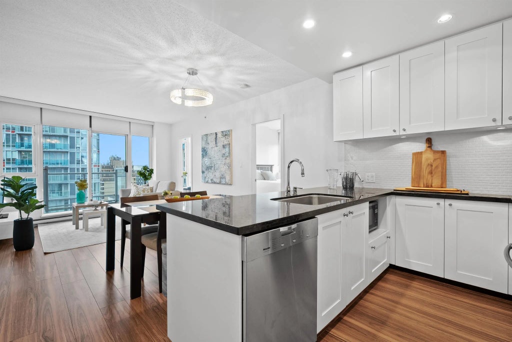 Luxurious living ~ Nestled in the vibrant heart of the Entertainment District, this exceptional corner unit, two bedroom plus den (guest room) residence offers unparalleled urban living. Large chef's gourmet kitchen with top of the line Miele built-in S/S appliances, great for entertaining. Stone counters, new laminate floors & modern finishes. New Blomberg washer dryer, all new LED lightings, re-finished bath tile flooring. Master bedoorm has an ensuite bathroom w/natural light, walk-in closet. Ample space to work from home in a bright corner office. The Raffles building places you steps from BC Place and Rogers Arena and moments from the seawall, Robson Street and Yaletown with premier dining and shopping destinations. Experience the epitome of downtown luxury living.