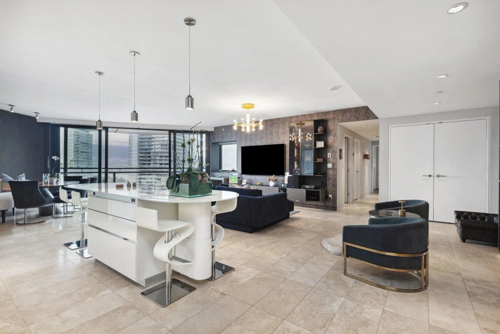 Live in art. Own a legacy. Designed by Foster + Partners, this 1,754 SF Jameson House residence offers cinematic panoramic views of mountains, water, and city from curved floor-to-ceiling windows. West-facing with stunning sunsets and LED-lit millwork throughout. Features include heated/cooled travertine floors, Sub-Zero & Gaggenau appliances, Italian Molteni&C cabinetry, Revox surround sound, custom bar, bespoke office, and textured designer finishes. Spa-inspired bathrooms with floating toilets and designer sinks. Primary suite with curved glass walls and Molteni&C closets. YSL-inspired display shelving, custom shoe closet, and backlit living wall. 2 parking. 24/7 concierge. Steps to seawall, fine dining, and luxury shops.