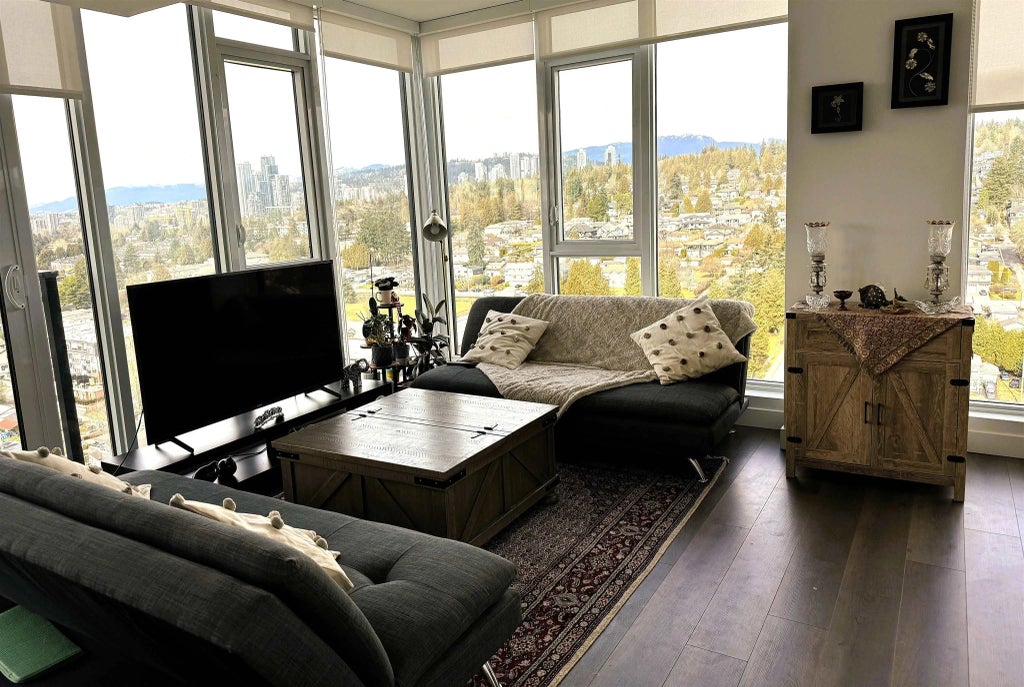 Bright and spacious 2-bedroom, 2-bathroom corner unit with breathtaking panoramic views. Enjoy the modern kitchen, perfect for cooking and entertaining, along with an ensuite primary bedroom for added convenience and privacy. Stay cool year round with a built-in air conditioner--with the cost conveniently included in the maintenance fee--for added comfort and peace of mind. Located just minutes from Lougheed Town Centre, SkyTrain stations and shopping centres, this home offers the ultimate in comfort and accessibility. Don't miss the chance to make this beautiful condo your new home!