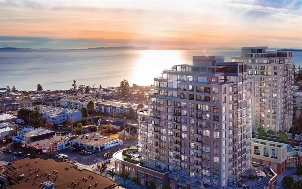 Modern 1-bedroom Bosa unit (2020) featuring new flooring, paint, high-end appliances, 9' ceilings, central A/C, Nuheat bathroom floors, and NEST thermostat. Steps to shops, banks, schools, restaurants, with Thrifty Foods below. Enjoy sunrise views and 15,000+ sqft of amenities: rooftop pool, hot tub, gym, party room, and terrace. School catchment: White Rock Elementary & Semiahmoo Secondary. Some photos virtually staged.