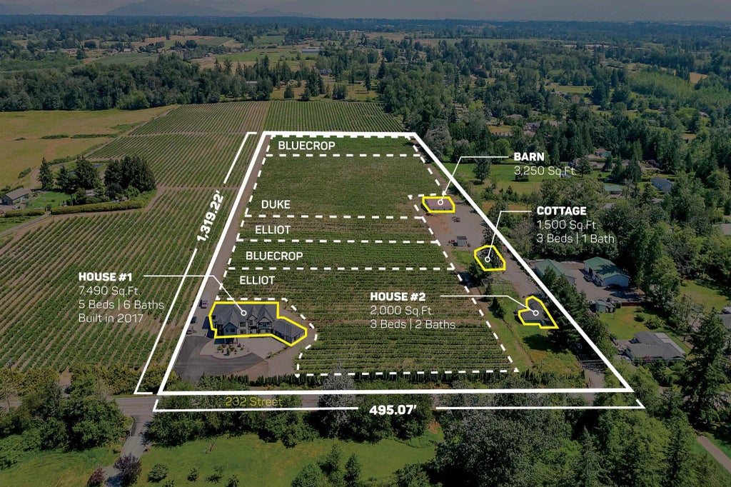 14.98 ACRES BLUEBERRY FARM WITH TWO HOUSES. The 7,490 SQ/FT Estate Home was built in 2017 and includes 5 spacious bedrooms each with its own walk-in closet & ensuite bathrooms (6 Bathrooms in total) a Game Room, Theater Room and Bar Room. The fully renovated second house is 2,000 SQ/FT with 3 bedrooms and 2 bathrooms. This property also includes a fully renovated 1,500 SQ/FT Cottage/Workshop with 2 bedrooms and 1 bathroom and a 3,250 SQ/FT Workshop/Barn. In 2006 approximately 12 Acres were planted in 3 varieties of blueberries, Duke, Bluecrop and Elliot producing approx. 110,0000 - 120,000 LBS annually. Close to all amenities with easy access to Fraser Highway, Highway #10, Highway #1, and the USA border.