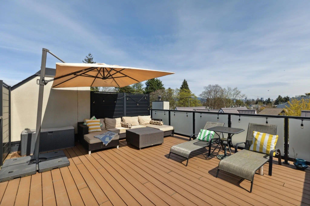 Welcome to this beautifully renovated 2-bedroom, 1.5-bathroom corner unit home in the heart of Kitsilano! Spanning 1,024 sqft across two levels, this bright and modern home offers privacy with no attached neighbours. Enjoy an open-concept kitchen featuring stainless steel appliances and sleek laminate flooring throughout. The highlight is the expansive 565 sqft rooftop deck with breathtaking views of the downtown skyline, North Shore mountains, and McBride Park — perfect for entertaining or relaxing. Renovated in 2018, this home blends style and comfort in one of Vancouver’s most desirable neighbourhoods. Also includes 2 parking stalls and 1 storage locker. Just steps to the beach, and surrounded by top-tier shops, restaurants, and cafes—this is Kits living at its finest!