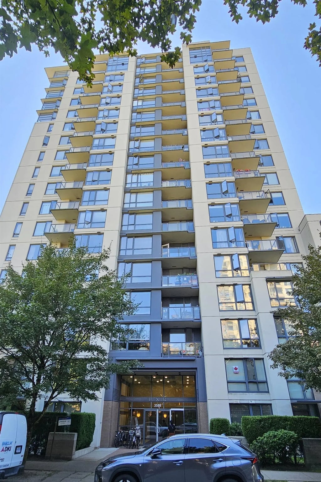 NEXUS by renowned builder Bosa in Collingwood area near Joyce Station/Bus #26 #27 #28 #41 #R4. North facing one bedroom corner unit, sitting around parks and trees with peeapoo mountain view. 8 ft x 7.5 ft covered balcony overseeing many clusters of cherry blossoms in spring and colorful maple leaves in fall. One underground parking, one 6 ft x 6 ft storage locker. Ready to move in.