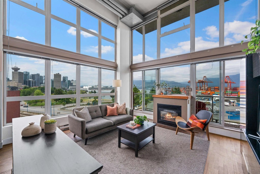 Exceptional northwest-facing 1 bedroom, 2 bathroom loft in Railtown/ Strathcona! This rare 2-level corner unit features soaring 16' ceilings and dramatic floor-to-ceiling windows that frame stunning, unobstructed views of Downtown Vancouver, Canada Place, Burrard Inlet, The Port of Vancouver and the North Shore Mountains. Designed for both comfort and creativity, this spacious loft includes a bathroom on each level, an open-concept living space, and a bright, airy bedroom overlooking the city skyline. Residents enjoy access to a 7,000 SF amenity building that includes a gym, wood and metal workshops, a ceramic studio, photo lab, and music/dance rehearsal spaces. Steps from Portside Park, cafes, shops, and all that vibrant Gastown has to offer. A true urban retreat.