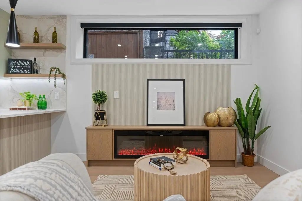 Stunning home in Grandview-Woodland, designed by award-winning ARCHITRIX with interiors by KD Interior Design. This 2 beds, 2 baths + den home features a spacious one-level layout, oak engineered floors, custom fluted millwork, built-in closets, and a cozy fireplace. Gourmet kitchen with Fisher & Paykel appliances, quartz counters, waterfall island, Riobel & Delta fixtures. Includes walk-in pantry/den, EV-ready storage shed, A/C heat pump, tiled patio, and pro landscaping. Steps to Commercial Dr, SkyTrain, Trout Lake & shops. Includes 1 parking, bike room, storage. Open House Sunday Sept 7, 2-4pm
