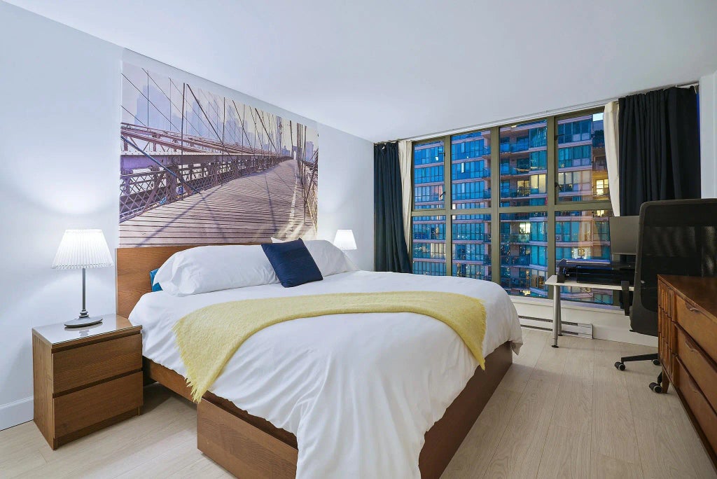Welcome to the National. Built by Bosa, this gorgeous 2bed, 2bth fully renovated unit offers it all. Let's start with the oversized balcony with amazing views of False Creek and the North Shore mtns. Open concept with tonnes of natural light and expansive views. 2 large bedrooms both with built-ins in the closets as well as a murphy bed in the second bedroom. Both bathrooms fully renovated with gorgeous showers and finishings and heated floors in the primary bath. Great building with lots of upgrades, 2 parking,EV charger, 1 locker, pet friendly with doggy bath, swimming pool, gym and sauna. Walk to seawall, cafes, skytrain, shopping and more. Well priced. Call now!