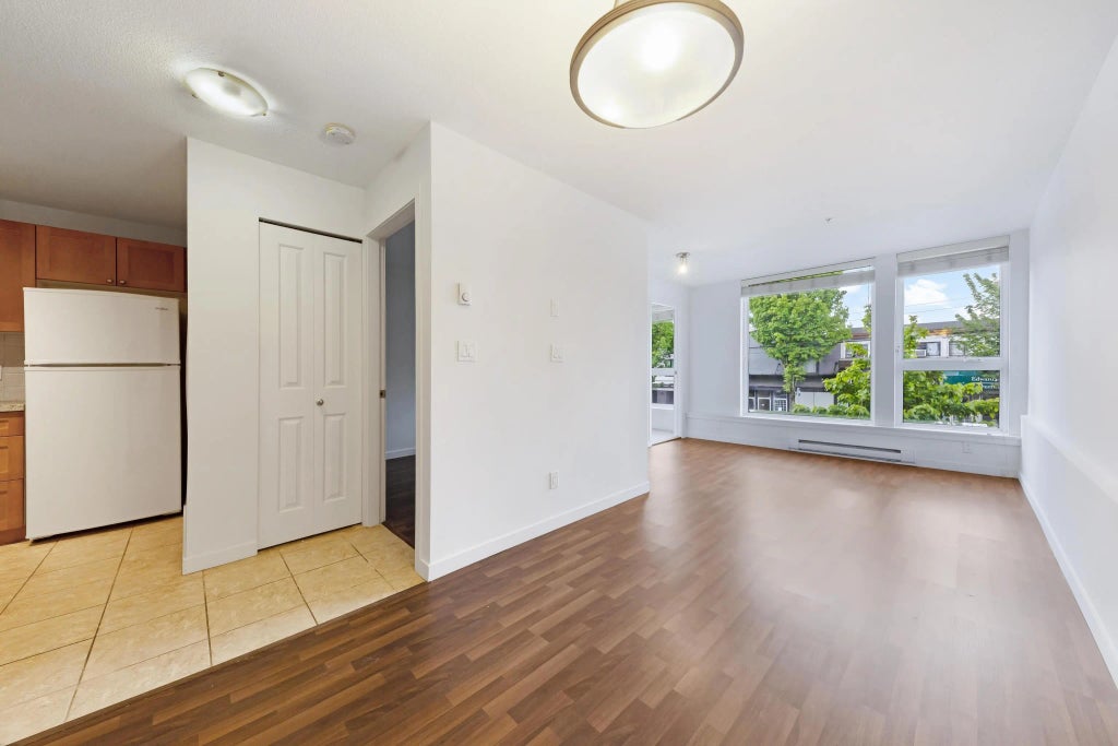 The SUGAR, a Concrete frame building. Freshly painted and move-in ready. Great value 2 bedroom + solarium + 1 bath condo. Open concept design connects the kitchen, dining and living room together. In-suite laundry. Tile throughout the kitchen, laminate floor throughout the rest of the home. 1 secured parking included. Incredible location close to restaurants, shopping, groceries and access to a major transit line that takes you into Downtown in only 20 minutes. Schools and the PNE only a few minutes walk away. School catchment: Dr. A.R. Lord Elementary and Templeton Secondary. Ideal for first time Buyers.