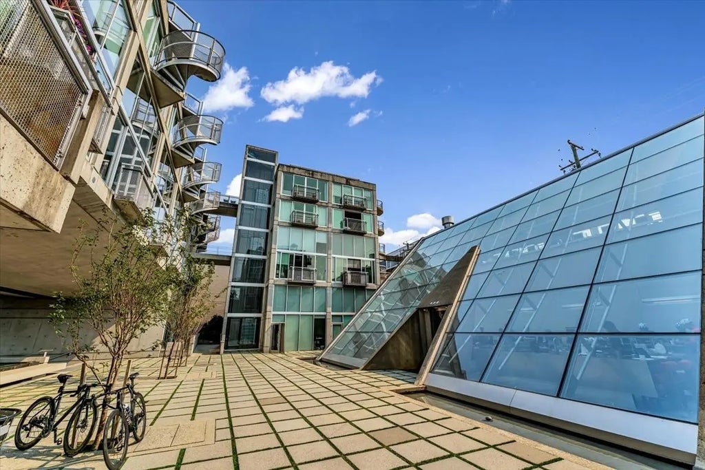 An architectural icon at the gateway to Granville Island—welcome to the award-winning Waterfall Building by Arthur Erickson. This one-bedroom loft with a spacious office/den (could be 2nd bedroom) features soaring 16’ ceilings, radiant heated concrete floors, exposed concrete walls, and a striking floating staircase. Juliet balconies on opposite ends create a refreshing cross-breeze, while floor-to-ceiling windows flood the home with natural light. Perfectly located just steps to Granville Island, W4th Ave and Granville shops. Zoned C-2B for live/work use. Includes one parking and one storage.