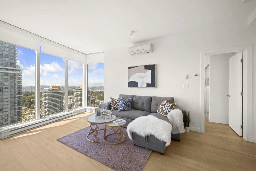 Welcome to Prime on the Plaza, a landmark concrete tower by Reliance Properties in one of Surrey’s fastest-growing hubs—just a 5-minute walk to SkyTrain, SFU, Central City Mall, and top cafés like Nemesis. This air-conditioned home features 180° unobstructed views of the city, mountains, and water. Enjoy 9-ft ceilings, laminate floors, and a split-bedroom layout for added privacy. Oversized windows and a covered balcony bring in year-round light and views. The open kitchen offers sleek cabinetry and a versatile island—perfect for dining, cooking, or working from home. Comes with 2 side-by-side parkings + 1 locker. Amenities include concierge, full gym, rooftop lounge, and kids' play area. Ideal for first-time buyers and investors. Book your tour today! OPEN HOUSE 9/20 (SAT) 2-4PM