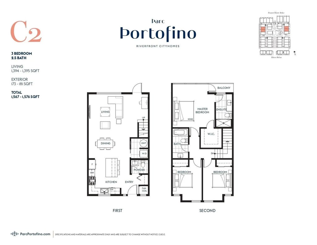 Introducing a brand new duplex-style townhome at Parc Portofino by Dava Developments, featuring stunning river views and an incredible rooftop deck. This spacious residence offers 1512 SF of living space complemented by 611 SF of outdoor areas. Inside, enjoy 3 bedrooms, 2.5 bathrooms, and modern finishes including 9 ft ceilings, laminate flooring, and a gourmet kitchen equipped with an island, stainless steel appliances, and quartz countertops. Additional highlights include seamless glass shower enclosures, roller shades, a full-size washer & dryer, and two secured parking spots. Located on the top two floors, this cityhome benefits from unique skywalks and a 2/5/10 year new home warranty. Conveniently situated near the riverfront boardwalk, parks, transit options, Tait Elementary, and Cam