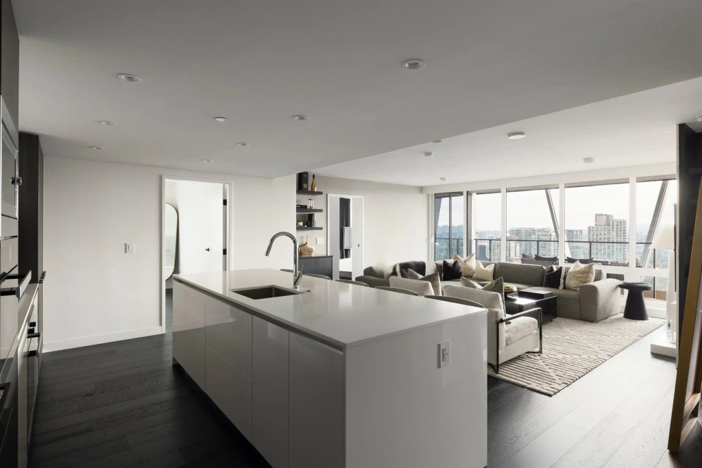 Elevated & updated corner home at 8X on the Park with panoramic views of False Creek, city, and mountains. This refined 3 bed, 2 bath residence features a 10ft natural stone island, integrated Miele appliances, custom millwork, powered blinds, and floor-to-ceiling windows. The open plan flows to an oversized covered patio with herringbone wood decking. Elegant bedrooms, a reimagined walk-in closet, engineered hardwood, natural tile, & A/C throughout complete the home. Includes 2 side-by-side parking, storage, and bike locker. Enjoy world-class amenities: concierge, fitness centre, and rooftop oasis. A rare, turnkey offering in one of Vancouver's premier buildings.