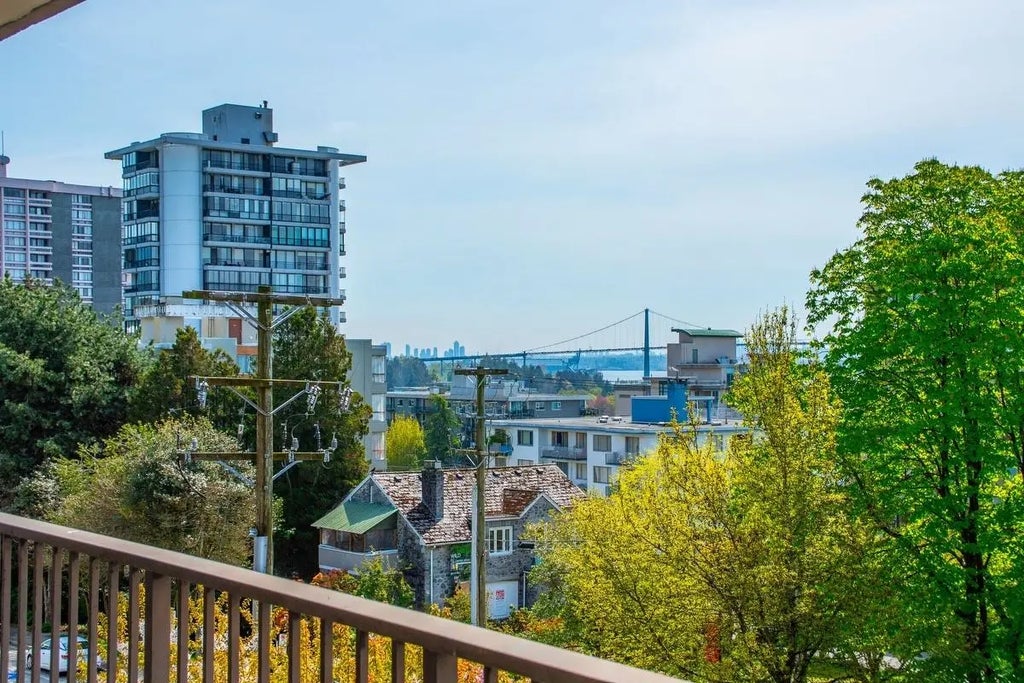 **$135K BELOW ASSESSMENT!** PETS ALLOWED. Nestled in the heart of Ambleside, this south facing 2 bedroom with 1.5 bathrooms, upper corner apartment in the Wesmoor building, offers an abundance of natural light, two generous sized bedrooms and two large covered patios to enjoy the partial bridge and ocean view! Spacious living room w/ hardwood floors and a beautiful comer gas fireplace that adds ambiance and warmth. NEW CARPETS and JUST PAINTED throughout! Excellent CONCRETE low-rise building with only 18 units on 7 floors. Enjoy the beautiful grounds and water feature at front entrance. Walking distance to all the best Ambleside has to offer - top amenities, shops, restaurants,seawall, parks and the beach!Rentals allowed. EXCEPTIONAL VALUE!
