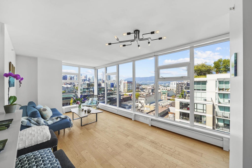 Welcome to your residence in the SKY! This NW corner suite w/ stunning panoramic views, the best of central city living. From your living room, bedrooms, & private balcony, take in sweeping vistas of the mountains & skyline. Functional layout - 2bed on opposite sides, 2bath, & walnut hw flooring throughout. True Chef’s kitchen boasts a gas stove, integrated Miele & Blomberg appl, lacquered European cabinets, a custom art glass backsplash, & Corian countertops—all within a bright open-concept design. Primary bedroom is filled w/ natural light & includes a serene ensuite w/ a cozy soaker tub. Additional comforts incl insuite laundry, storage locker, & option to continue renting a parking stall. Concrete building: playground, gym, outdoor BBQ, garden, & rooftop terrace. Move-in ready HOME!