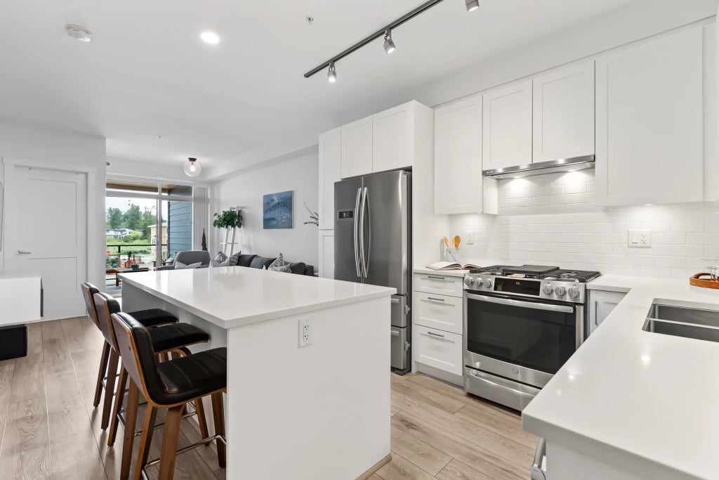 Bright, stylish, and in the heart of Willoughby Town Centre, this 2 bed, 2 bath condo at Grayson checks all the boxes. It’s been incredibly well cared for and shows like new. Smart layout with two true bedrooms, sunny south-facing views, and wide plank flooring. The kitchen has a gas stove, stainless appliances, and a big eat-up bar, perfect for hosting. The primary suite features a walk-in closet and sleek en suite with double sinks and heated floors. The second bedroom has a window and works great as a kid’s room, office, or guest space. Large covered deck, gym, playground, and social lounge with BBQ and fire pit seating. Includes two parking stalls and a roll-up storage locker. Steps to parks, schools, and shopping.