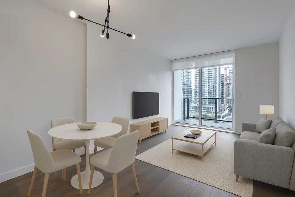East-facing 1 bed, 1 bath at Akimbo - Brentwood’s bold new tower known for its striking architecture and signature angled balconies. This move-in ready home features a bright, open layout with durable laminate flooring, air conditioning, custom shelving, and a sleek kitchen with quartz countertops, gas cooktop, and modern cabinetry. The spa-inspired bathroom showcases high-end fixtures and porcelain tile. Comes with one parking stall and a storage locker. Just minutes to Brentwood and Gilmore SkyTrain stations, shops, restaurants, parks, and the revitalized Brentwood Mall. Ideal for first-time buyers, down-sizers, or investors.