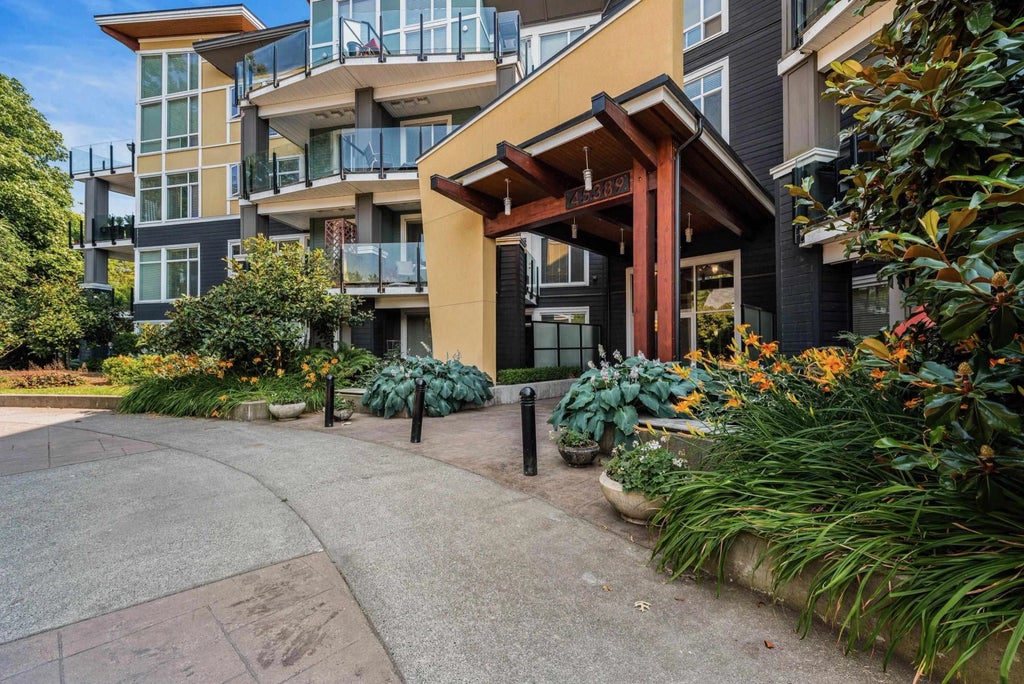 This FABULOUS CORNER UNIT at the CENTRALLY located Radius apartments in Garrison Crossing is IDEAL for those looking for individual living. Featuring 1 SPACIOUS bedroom w/an IMMACULATE 4 pc ensuite, GORGEOUS light wood kitchen w/built-in microwave, chic white backsplash, S/S appliances & a GENEROUS living room w/floor to ceiling windows - allowing AMPLE natural light throughout the main living space. A large covered patio w/SERENE view overlooking the boulevard is FANTASTIC for relaxing OR entertaining - no obstructed views! Plus, enjoy the convenience of a sizable laundry room w/extra storage space. Situated only steps from shopping, transit, the Vedder Trail & MORE - this EXQUISITE home offers the perfect blend of modern living & UNBEATABLE location. Don't miss out on this RARE gem!
