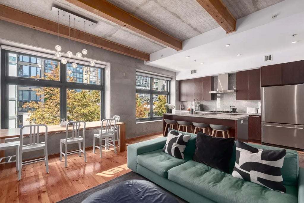 Experience loft living at the McMaster, a boutique heritage conversion by Townline Homes set in the heart of Yaletown. This 2-bed/2-bath residence combines character and comfort with reclaimed fir floors, exposed brick and concrete, and soaring 10-foot ceilings. A gourmet kitchen with an island, granite counters, and premium stainless steel appliances, including a gas range, makes entertaining effortless. The generous floor plan offers frosted glass accents and a primary ensuite designed for relaxation. Central heating and AC provide year-round comfort, while thoughtful storage solutions and secure parking add everyday convenience. With only 15 homes in the building, this is a rare opportunity to own a piece of Vancouver’s architectural history reimagined for modern living. OH Oct 5 2:30-4