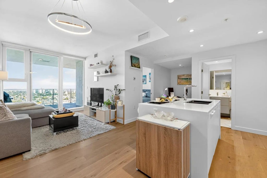 Beautiful east-facing top-floor Polaris unit by Transca, located in the centre of Metrotown. Enjoy breathtaking city and mountain views from the spacious 268 SQFT balcony. This penthouse features 1 bedroom plus a versatile den, and an open-concept floor plan ideal for modern living. Luxurious finishes include Italian-made kitchen cabinetry, stainless steel appliances, quartz countertops and backsplash, and 9-foot ceilings. Over 10,000 sqft of amenities, including a courtyard, fitness centre, guest suite, table tennis room, meeting room, golf simulator, and a party lounge with outdoor BBQ and fire pits, and much more. Concierge service, bike repair room. Steps away from the SkyTrain, Bonsor Community Centre, Metrotown, TNT, restaurants, and Crystal Mall. MLS # R3052364