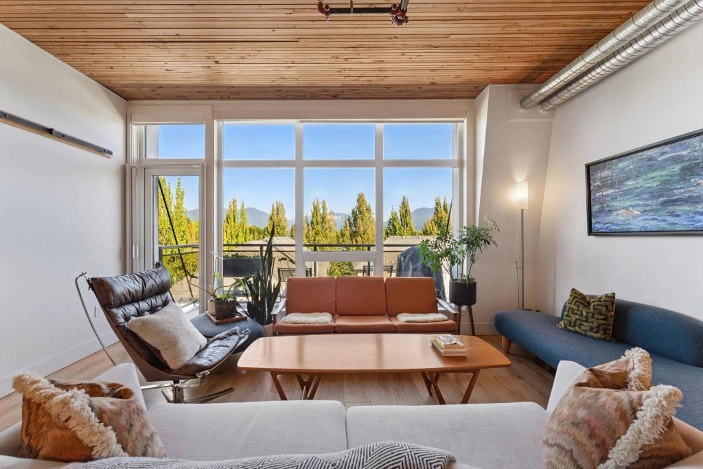 Welcome to The Carleton, a stunning 2-bed, 2-bath, 1,005 sqft top-floor condo in North Burnaby’s vibrant Heights. This loft-inspired home blends modern style with community charm. Enjoy 9’-6" wood ceilings, exposed piping, wide-plank laminate floors, and north-facing windows flooding the space with light. The gourmet kitchen boasts a Fulgor Milano gas range, stainless steel appliances, and quartz countertops. Relax on your private balcony with a mountain view. Includes front-load washer/dryer, 1 parking, 2 lockers. Wheelchair-friendly design. Steps from cafés, eateries, grocers, parks, and the ocean, with transit to downtown Vancouver in 20 minutes.