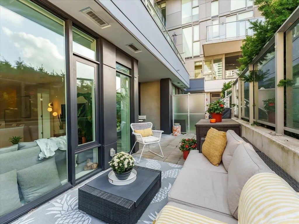Stunning 2 bed/2 bath south-facing corner home in a premium 3-year-old River District building. Rare private entry opens to a 200 sf sunny patio—ideal for pets, gardening, BBQs, or entertaining with privacy. Luxury interiors feature timeless colours, large kitchen island with full-size Jenn-Air appliances, gas range, spa baths, engineered flooring, built-ins, roller blinds & over-height ceilings. Excellent layout with separated bedrooms, open living/dining & foyer entry. Primary has floor-to-ceiling windows to patio; 2nd bedroom perfect for guests/office. Resort-style amenities: concierge, rooftop pool, hot tub, gym, lounge, BBQ deck, garden plots, EV chargers, bike storage & visitor parking. Steps to shops, dining, parks & the Fraser River.