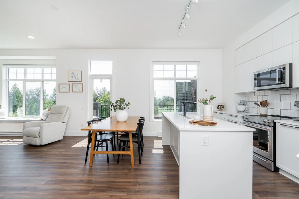 Welcome to this stunning Burke Mountain townhome with incredible views at Victoria by Mosaic. This 4 bed, 4 bath plus flex offers 2,389 sq ft of exceptional living space! Bright, open plan with 10’ ceilings and heated entry floors on the main. Large kitchen w/island, sleek cabinetry, living room with custom built-in shelving + a gorgeous fireplace and surround. The expansive balcony has unobstructed South views! Garage and powder on main added convenience. Up offers a versatile flex area, 3 beds, primary ensuite w/WIC, side x side laundry. Lower has 10’ ceilings with a walkout basement that opens to a covered patio and fenced yard with extended grass. Large family room, 4th bed, full bath, and a huge storage room. Close to trails, parks + quick access to shops, schools, parks + recreation.