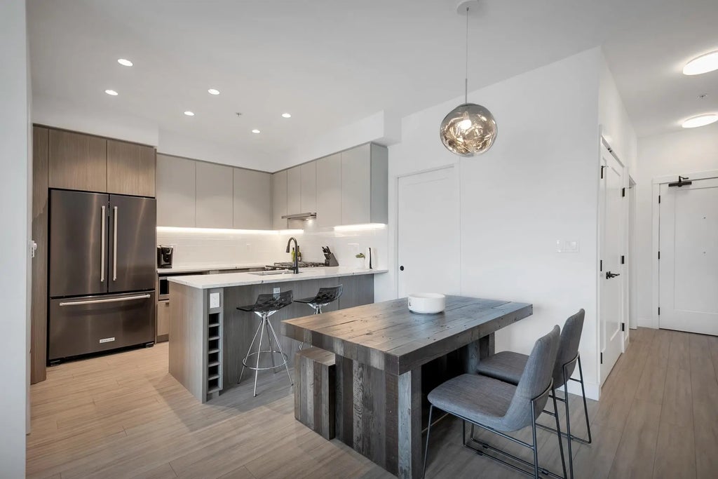 Welcome to Ella by Trillium, where lifestyle comes first! Gather with friends in the resident lounge, get inspired in the co-working space, or pop downstairs to the ground-level shops. Located steps from The Drive, with bike routes, transit, and highway access nearby, convenience is built in. This top floor 2 beds + den & 2 baths, features 9-ft ceilings, expansive windows, a modern kitchen with quartz counters, stainless steel appliances, & gas stove. Enjoy a bonus pantry, a welcoming dining area, spacious primary bedroom with ensuite, an office nook, & flexible second bedroom. The quiet east-facing balcony w/ gas hookup, perfect for morning coffee or evening BBQs. Added perks include pet-washing station, Modo carshare, 1 parking, 2 storage lockers, and a 2/5/10 warranty. OPEN Sun OCT 11th