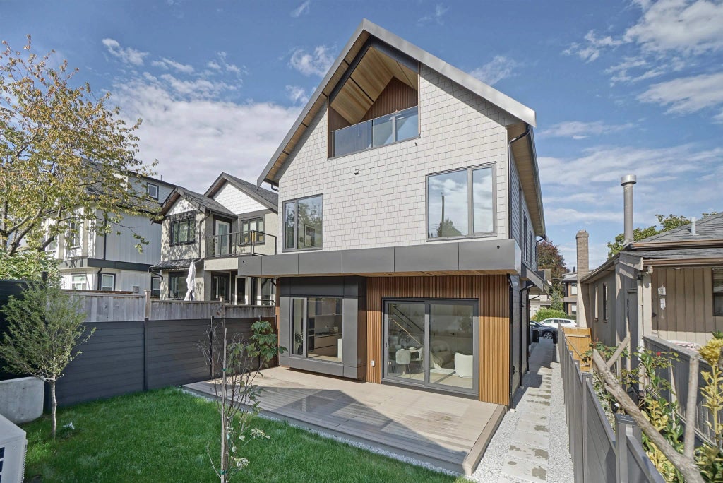 Brand-new luxury duplex in prime Kitsilano! This beautifully crafted home features 10’ ceilings, triple-glazed aluminum windows and doors, premium custom millwork, and a full Miele appliance package. Comfort is provided by Daikin multi-zone A/C and heat pumps on every floor. The main level offers motorized blinds, while Techwood and metal siding add durability and efficiency. Oversized sliding doors open to a sunny deck and landscaped private yard for seamless indoor-outdoor living. A smart home system controls lighting, speakers, blinds, doorbell, and cameras. Additional highlights include an EV-ready garage, crawl space storage, fingerprint-lock gate, barrier-free showers, and in-floor heating in all bathrooms. School catchments: Carnarvon Elementary & Kitsilano Secondary.