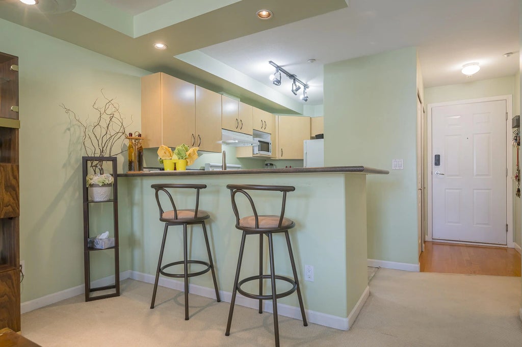 Welcome to The Bentley! Spacious 1 bed 1 bath condo with well-appointed kitchen, plenty of storage and counter space, dishwasher and in suite laundry. Covered patio, 1 parking spot, 1 storage locker. Well-run complex, with fully equipped gym, entertain guests in the common room, take advantage of the guest suite, gated courtyard and secured underground parking. Centrally located with everything you need just a short walk away. From a variety of shops and restaurants to grocery stores and recreational facilities, daily errands and entertainment at your door. Commuting is easy with the future SkyTrain station within walking distance. The pet-friendly allowing for 2 pets (1 cat and 1 dog or 2 cats, or 2dogs) with no size restrictions. All of this makes for a fantastic investment!