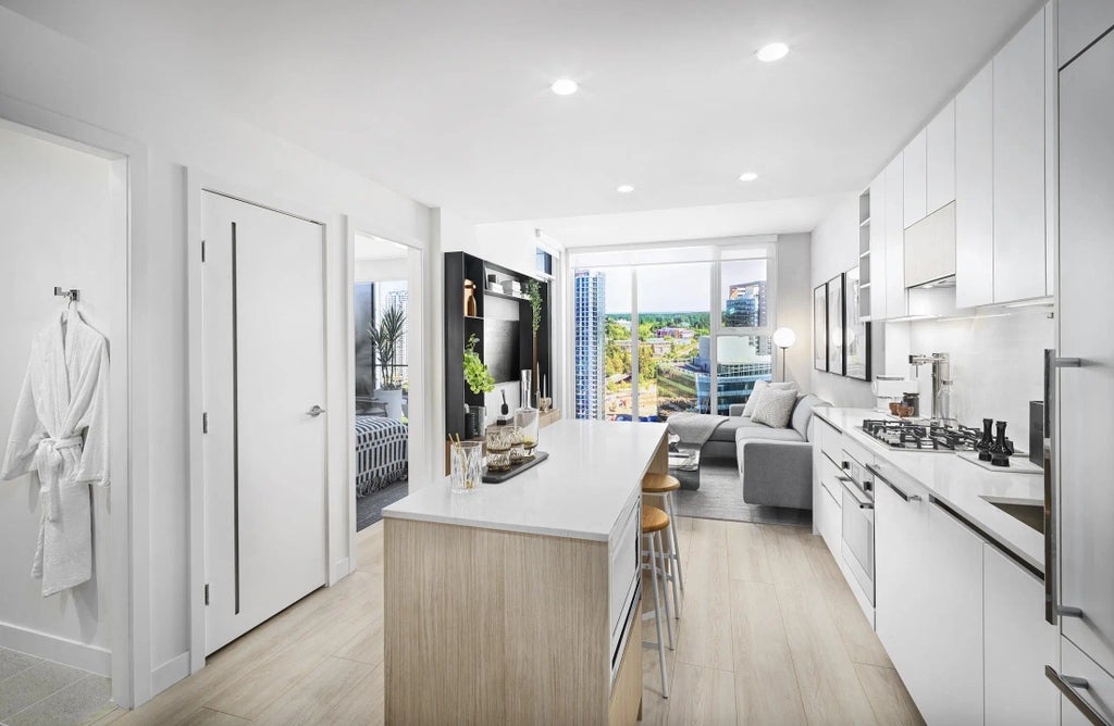 This brand new, move-in ready 1 bedroom home features exceptional views from the large 105 square foot patio. The 9 ft floor-to-ceilings with expansive windows invite natural light throughout, a kitchen that is designed by award winning Ste.Marie for entertaining with an island to host guests and excellent storage. Located beside Holland Park and across from King George SkyTrain Station this location offers convenience at your doorstep. To ensure comfort year round, this home features air conditioning. Residents enjoy 4 levels of innovative amenities—over 40,500 sq. ft. Book an appointment today to visit this master planned community by Century Group!